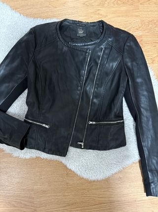Chaqueta de cuero con un diseño moderno y elegante. - Cierre de cremallera asimétrica. - Bolsillos frontales con cremallera. - Cuello redondo. en el cuello tiene un defecto que es que se está pelando