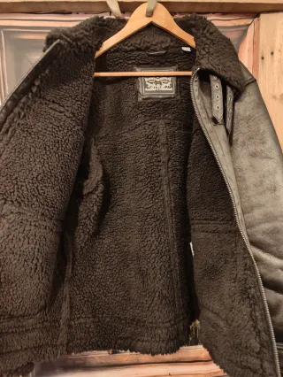 Chaqueta estilo aviador con forro sherpa de Levi's. Combina un exterior en imitación piel con un cálido interior de borreguito. Tallas L y XL - Cuello con solapas de borreguito. - Cierre de cremallera. - Dos bolsillos frontales con solapa y botón. - Puños y bajo con detalle de borreguito.