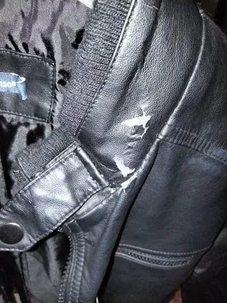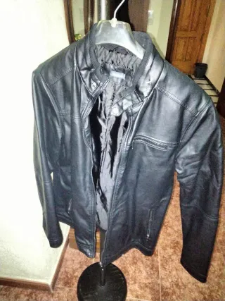 Chaqueta de cuero sintético para hombre.TIENE UN PEQUEÑO DESPERFECTO EN EL CUELLO - Diseño tipo biker. - Cuello con cierre de botón. - Cremallera frontal. - Bolsillos con cremallera.