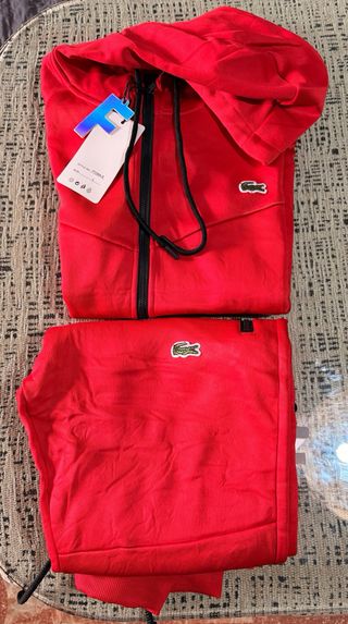 Conjunto deportivo de dos piezas. Nuevo con etiquetas. Sin uso. - Sudadera con capucha y cremallera. - Pantalón a juego. - Logo del cocodrilo distintivo en ambas prendas.