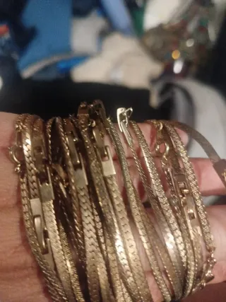 Conjunto de pulseras doradas con un diseño elegante. - Diseño de cadena estilo serpiente. - Acabado brillante. Hay 20 pulseras y también tengo aparte los collares 2 euro por cada pulsera 4 por el cotar conjunto entero 5 euro