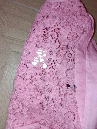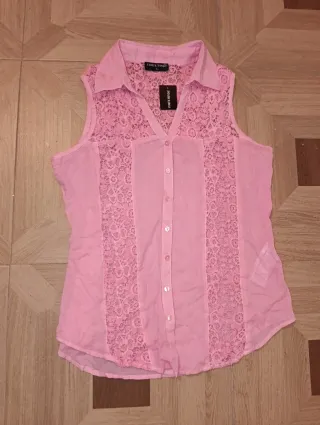 Elegante blusa rosa sin mangas, con detalles de encaje en la parte delantera. - Diseño con cuello camisero. - Cierre de botones. - Panel de encaje en el frente. - Talla L.