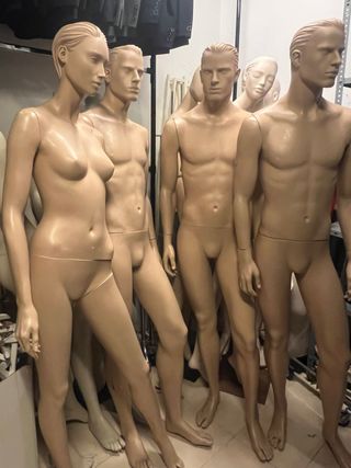 Lote de Maniquíes de cuerpo entero en color beige. - 3 hombres y 1 mujer - mide 2 metros - Diseño realista. - Articulado para diferentes poses. - tiene algunas partes rotas pero no se ven si le pones la ropa .