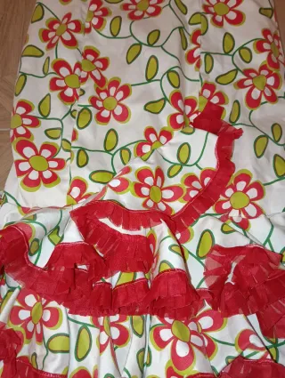 Falda flamenca con un diseño alegre y vibrante, perfecta para bailar o para un evento especial. - Estampado de flores rojas y hojas verdes sobre fondo blanco. - Múltiples volantes en cascada en el bajo. - Adornos de volantes rojos en los bordes de los volantes.