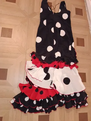 Traje de flamenca con un diseño llamativo y volantes. - Cuerpo negro con lunares blancos. - Falda con múltiples volantes. - Volantes intercalados en rojo y blanco con lunares negros.