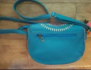Bolso bandolera con un llamativo diseño circular en la solapa, tipo mandala Con detalles calados. - Cierre de solapa. - Correa ajustable. - Adornos colgantes: estrella negra, corazón rosa y círculo naranja. Usado un par de veces, como nuevo. Tamaño mediano, mide 26 por 19 cm.