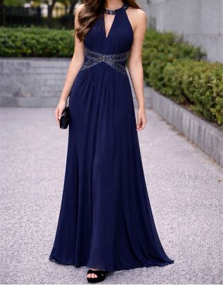 Elegante vestido largo de color azul, perfecto para eventos especiales. Presenta un diseño con escote halter y detalles de pedrería en la cintura y el cuello. - Escote halter. - Cintura adornada con pedrería. - Cuello con detalles de pedrería.