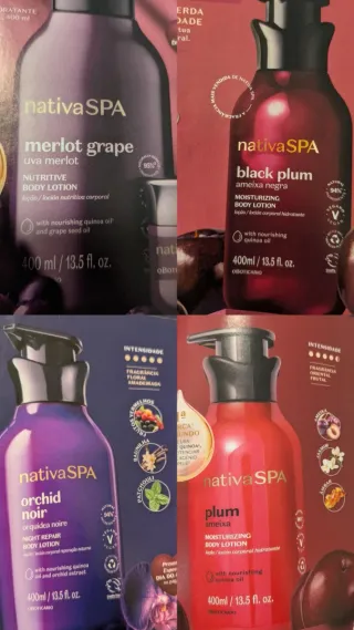 Lote de lociones corporales de la marca Nativa SPA. 100% vegano - Loción Shea Ultra-Moisturizing. - Loción Golden Plum Radiant. - Loción Quinoa Firming. - Loción Black Plum Moisturizing. - Loción Orchid Noir Night Repair. - Cada botella contiene 400 ml / 13.5 fl. oz.