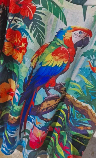 Camiseta con un vibrante estampado tropical, ideal para añadir un toque de color a tu armario. Se encuentra en perfecto estado. - Diseño con loro y flores exóticas. - Manga corta.