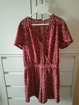 Mono corto en tonos teja y blancos. Presenta un escote cruzado y cintura elástica. - Manga corta. - Bajo tipo short. Visita mi perfil.