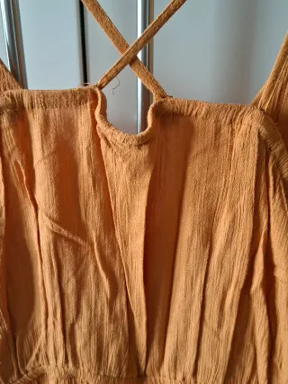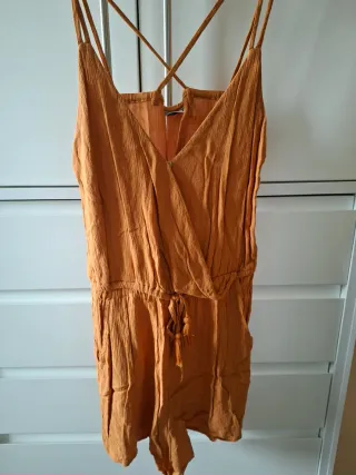 Mono corto de tirantes y detalle de borlas. El tejido es ligero y con textura. Color mostaza. - Diseño cruzado en la parte superior. - Tirantes finos cruzados en la espalda. - Bolsillos laterales. Visita mi perfil.