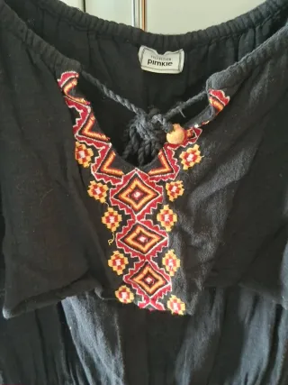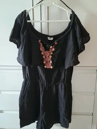 Mono corto negro con detalles bordados en el escote. - Escote barco de volante, con cordones y abalorios. - Mangas cortas tipo volante. - Cintura elástica. - Bolsillos laterales. Visita mi perfil.