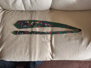 Corbata con estampado de personajes de Disney. - Diseño con lunares rojos. - Personajes de Mickey Mouse y amigos. - Fondo verde con detalles. - Tejido de seda.