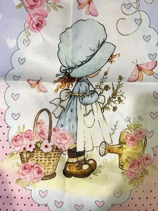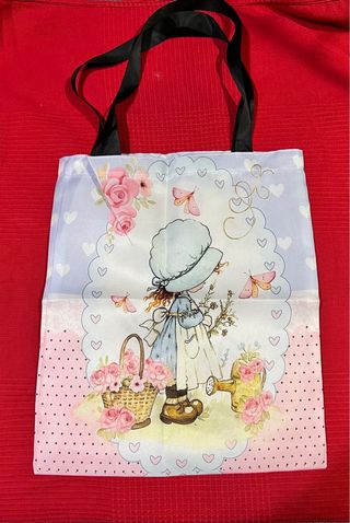 ‼️SIN ESTRENAR ‼️ PRECIOSA BOLSA DE TELA con dibujo de una de las famosas muñecas de la ilustradora impresión por ambas caras perfecto para COLECCIONISTAS de los dibujos de Sarah kay - Estilo de dibujo clásico. ‼️NO NEGOCIABLE ‼️ 🔹ENTREGO EN MANO 🤝EN ALGETE Y HAGO ENVÍOS POR WALLAPOP Ilustración encantadora de una niña con un sombrero y un vestido azul, rodeada de flores y mariposas. - Diseño con una cesta llena de rosas. - Incluye una regadera amarilla. - Detalles de corazones y encaje en el borde.