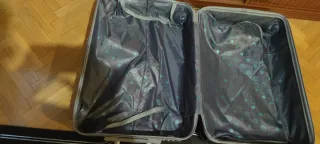 Maleta de viaje en color negro, utilizada únicamente en una ocasión. - Interior forrado con diseño de círculos. - Cintas de sujeción interiores.