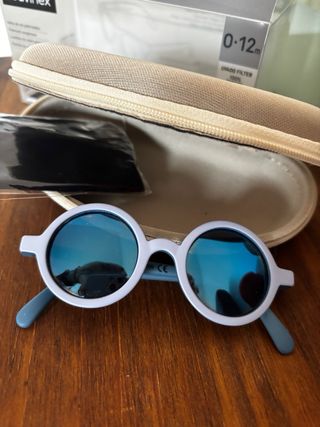 Gafas de sol para bebés de 0 a 12 meses, con montura redonda y lentes azules. - Incluye funda protectora y paño de limpieza. - Montura en color gris claro. - Lentes con filtro UV400.