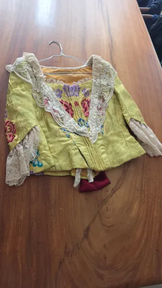Precioso corpiño de fiesta con un diseño llamativo y elegante. - Tejido principal en color amarillo con intrincados bordados florales. - Cuello adornado con encaje blanco y detalles de pedrería. - Lazos de satén en color burdeos con un broche decorativo. - Mangas con puños de encaje. - Detalles bordados en las mangas y en la parte frontal.
