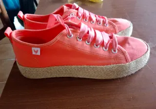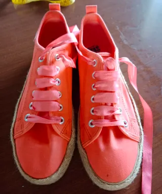 Zapatos planos de lona en color naranja con detalles de esparto en la suela. Cuentan con cordones de cinta rosa. - Zapatos de lona. - Suela de esparto. - Cordones de cinta. Tienen una manchita muy pequeña en la punta del pié izquierdo, se nota en la foto.