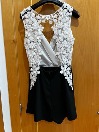 Mono corto con diseño elegante y moderno. - Parte superior cruzada en blanco. - Detalle de encaje en la espalda. - Pantalón corto en negro.