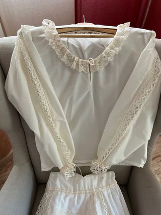 Camisa interior de fallera con detalles de encaje. - Cuello redondo con volante de encaje. - Mangas largas con puños de encaje. - Adorno de encaje en las mangas. Dispongo de enaguas y otra camisa interior de manga corta a conjunto.