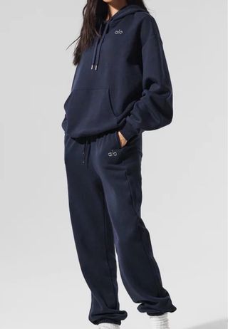 Conjunto de chándal de la marca Alo en color azul marino. - Sudadera con capucha y bolsillo. - Pantalón de chándal con cordón ajustable y bolsillos - Etiquetas originales - Símbolo en plata