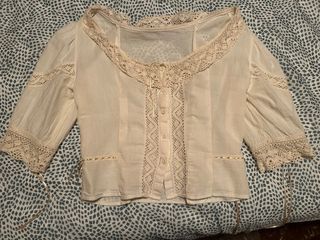 Camisa interior de manga corta, ideal para traje regional. Talla mediana. Firma: La llar del fil. - Cuello con puntilla. - Cierre de botones. - Mangas con puntilla. Dispongo de otra camisa de manga larga y la enagua a conjunto.