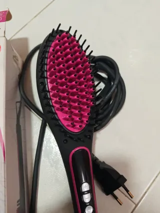 Cepillo alisador eléctrico para el cuidado personal. - Diseño ergonómico. - Mango con acabado en negro y detalles en rosa. - Cable de alimentación.