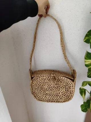 Bolso hecho a mano con material de yute. - Diseño tejido. - Cierre con cordón. - Asa para llevar al hombro.