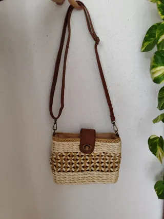 Bolso de mano tejido con detalles en cuero. - Material principal: yute. - Cierre de solapa con broche. - Asa de cuero ajustable.