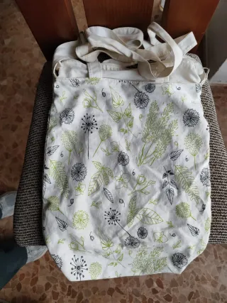 Bolso de tela con un bonito estampado de flores y hojas en tonos verdes y negros sobre fondo blanco. Las asas son de color crudo. - Diseño floral. - Asas de tela.