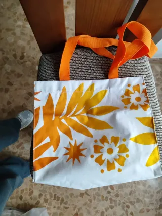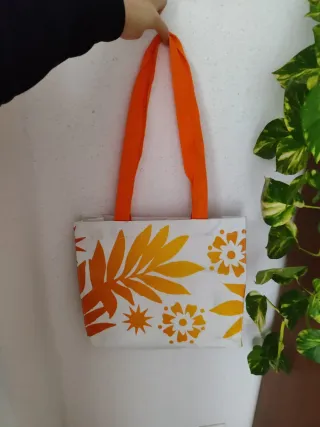 Bolso impermeable con un alegre estampado floral en tonos naranjas y blancos. Sus asas naranjas lo hacen fácil de llevar. - Diseño con hojas y flores. - Material impermeable.