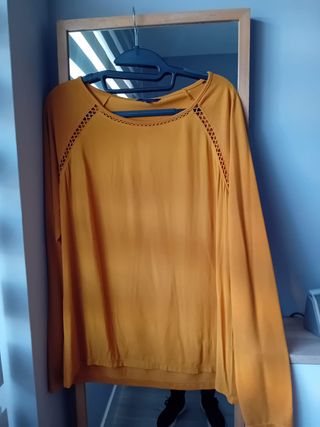 Camiseta de manga larga en color amarillo mostaza.Con detalles calados en los hombros. En perfecto estado, usada dos veces. Si necesitas alguna medida de la prenda pídemela. Hago envíos.