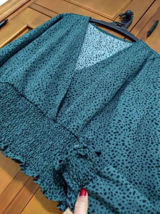 Camiseta de manga larga con un diseño moderno y favorecedor. - Cuello en V. - Cintura elástica fruncida, panel de abeja. - Puños ajustados con volante. - Puede valer para una talla L.
