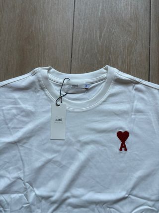 Camiseta de manga corta de AMI Paris en color blanco. Presenta el icónico detalle del corazón bordado en rojo en el pecho. Nueva nunca usada, con etiquetas - Cuello redondo. - Manga corta. - Logo de corazón bordado.
