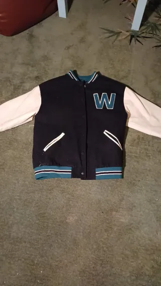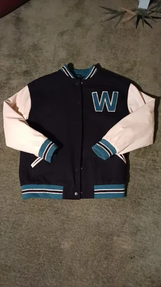 Chaqueta bomber estilo universitario con detalles en contraste. - Cuerpo principal en color negro. - Mangas en color beige. - Ribetes en cuello, puños y bajo con rayas verdes y blancas. - Tiene un pequeño defecto en la manga izquierda, el cual está indicado en las fotos