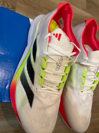 Zapatillas deportivas Adidas Adizero Boston 12. - Color blanco con detalles en rosa y amarillo neón. - Diseño ligero y transpirable. - Suela con tecnología Lightstrike Pro.