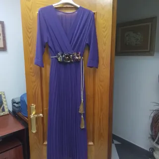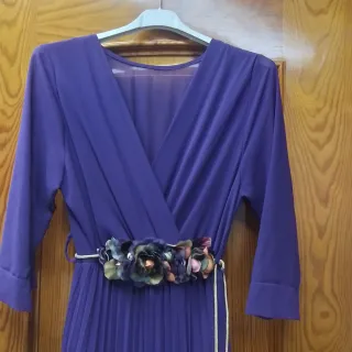 Elegante vestido morado con cinturón floral