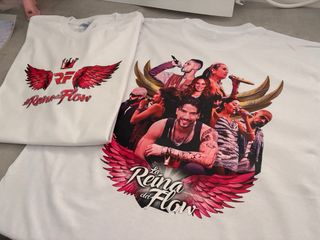 Camiseta blanca con diseño de La Reina del Flow y logo RF. - Diseño frontal con alas rojas y corona. - Estampado trasero con personajes de la serie. - Todas las tallas disponibles