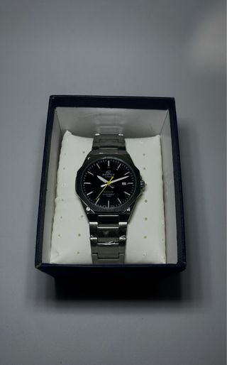 Casio Edifice modelo EFR-S108, con esfera negra y caja de 40 mm. Reloj de cuarzo, fino, elegante y muy versátil para uso diario o más formal. Brazalete de acero inoxidable y diseño limpio característico de la gama Edifice. Se encuentra completamente nuevo, conservando los plásticos de fábrica en varias partes. Si necesitas más información o cualquier detalle adicional, estaré encantado de ayudarte.