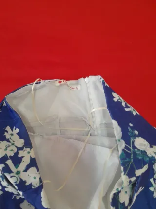 Vestido corto con un estampado floral vibrante. Su diseño asimétrico y de un solo hombro le da un toque moderno y elegante. - Diseño de un solo hombro. - Estampado floral blanco sobre fondo azul. - Corte asimétrico en la falda.