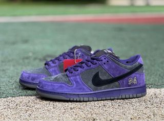 Zapatillas Nike Dunk Low con detalles en morado y gris. - Diseño de gamuza. - Swoosh negro. - Número 94 bordado en el talón. - Logo Supreme en la mediasuela.