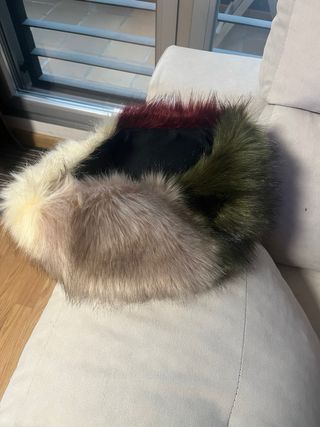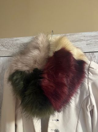 Cuello de pelo sintético con un diseño de cuatro colores vibrantes. Añade un toque de estilo a cualquier prenda. - Diseño de cuatro colores. - Material de pelo sintético suave.
