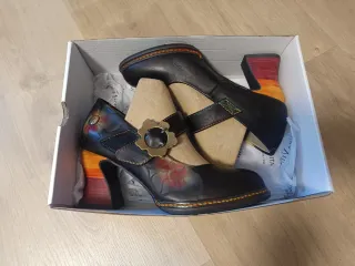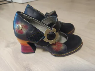 Elegantes zapatos de la marca Laura Vita, sin estrenar. - Diseño con flores pintadas. - Tacón con degradado de colores. - Adorno floral en la tira. - Cierre de velcro en la tira.