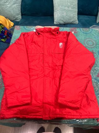 Chaquetón de hombre muy cálido, ideal para el frío. - Cierre frontal con cremallera y botones. - Bolsillos con solapa. - Puños ajustables con velcro. - Cuello alto. - emblema del granada club fútbol