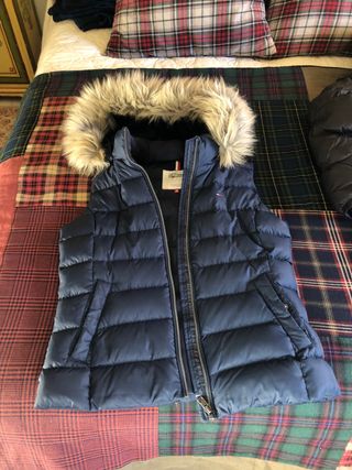Chaleco acolchado de mujer con capucha de pelo sintético. - Color azul marino. - Cierre de cremallera. - Bolsillos laterales.