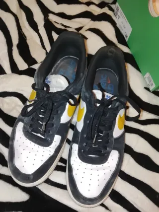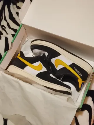 Zapatillas Nike Air Force 1 con un diseño llamativo. - Combinación de colores negro y amarillo. - Detalle del logo Swoosh en amarillo. - Inscripción AIR FORCE 1 en el talón. -tiene unos pequeños desperfectos pero no son visibles al usarlas