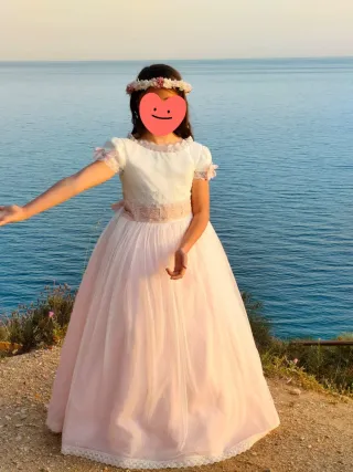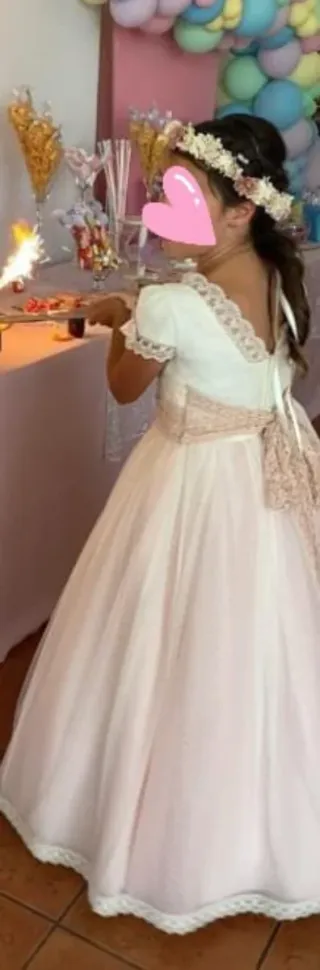 Vestido de comunión con un diseño elegante y delicado. - Espalda semi descubierta. - Fajín de encaje rosa. - Adornado con flores en la cintura y diadema. - Falda amplia de tul.