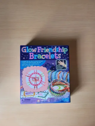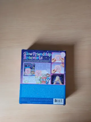 Kit Nuevo para crear pulseras de amistad que brillan en la oscuridad. - Incluye una rueda para tejer. - Permite hacer pulseras planas y redondas. - Materiales para hacer 12 pulseras.