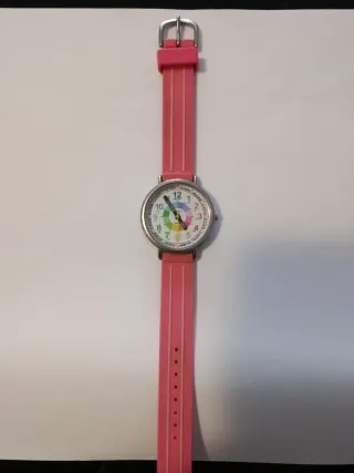 Reloj con correa de silicona rosa y esfera decorada con un círculo de colores. Perfecto para aprender las horas - Correa de silicona. - Hebilla metálica. - Esfera con números y diseño de arcoíris.