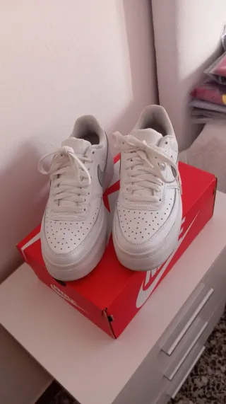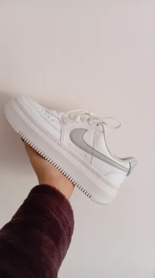 Zapatillas Nike Air Force 1 con plataforma en color blanco y detalles plateados. Perfectas para un look casual. - Diseño clásico con cordones. - Suela gruesa de plataforma. - Swoosh plateado en el lateral.